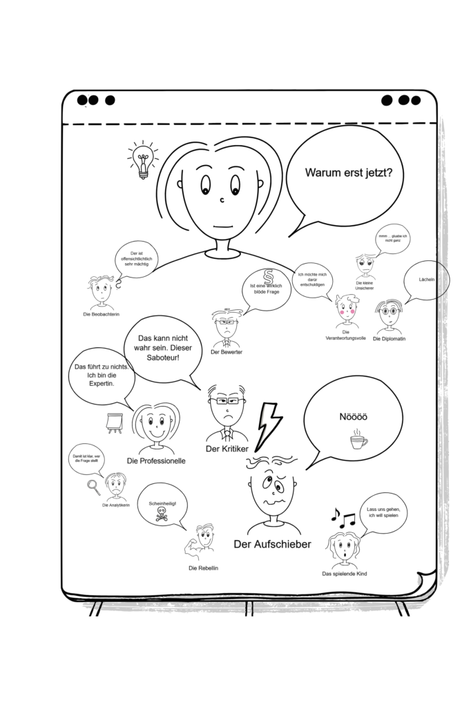„Die Beratung mit dem Inneren Team bietet eine lebendige, kreative und höchst effektive Möglichkeit, mit Persönlichkeitsanteilen zu arbeiten. Coach und Klient erkunden gemeinsam, welche inneren Anteile des Klienten sich zu seinem Anliegen zu Wort melden. Welche Botschaften, welche Gefühle haben diese unterschiedlichen Teammitglieder und in welchem Verhältnis stehen sie zueinander? Wer ist laut (womöglich zu laut), wer sollte mehr Gehör finden? Welche Konflikte gibt es, wo und wie entstehen Blockaden?